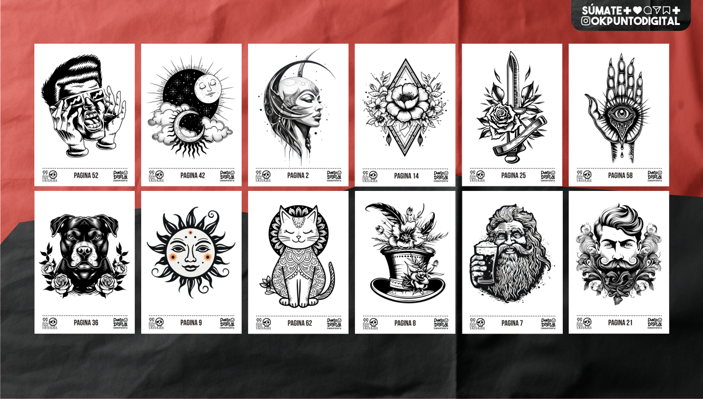 2 - Calidad profesional: Todos los diseños están creados en alta resolución y en color negro, listos para ser impresos en formato A4 y llevados a tu tatuador.